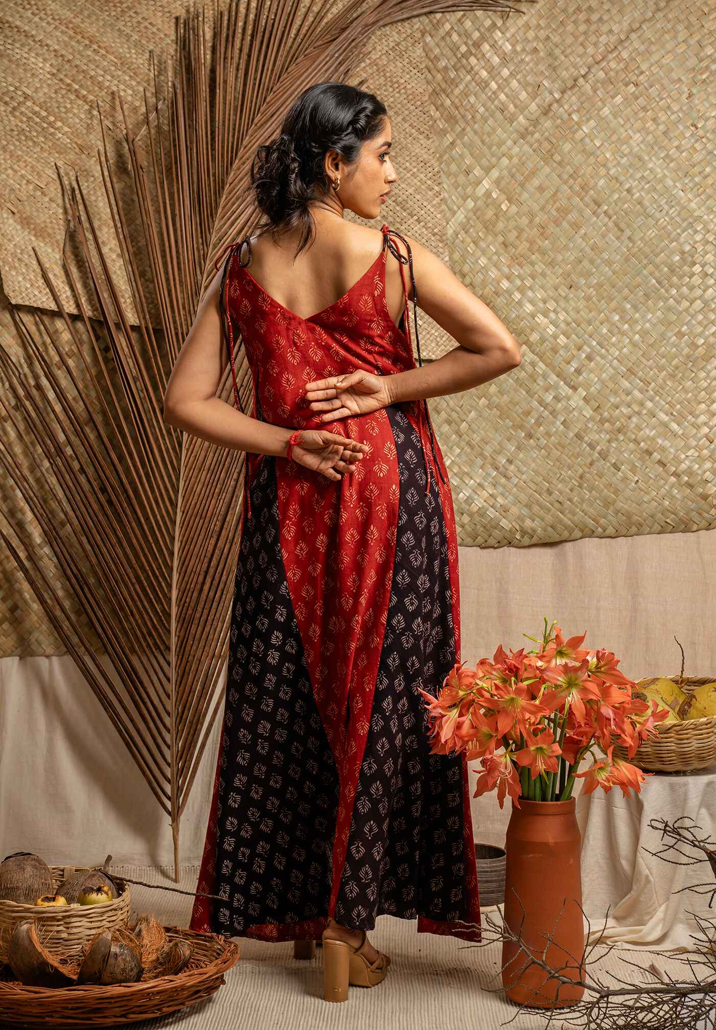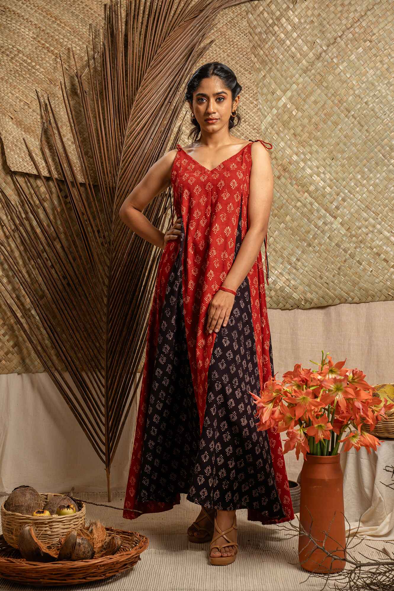 Turn heads in our bold red and black hand block printed panellled dress with a trendy tie at shoulder design