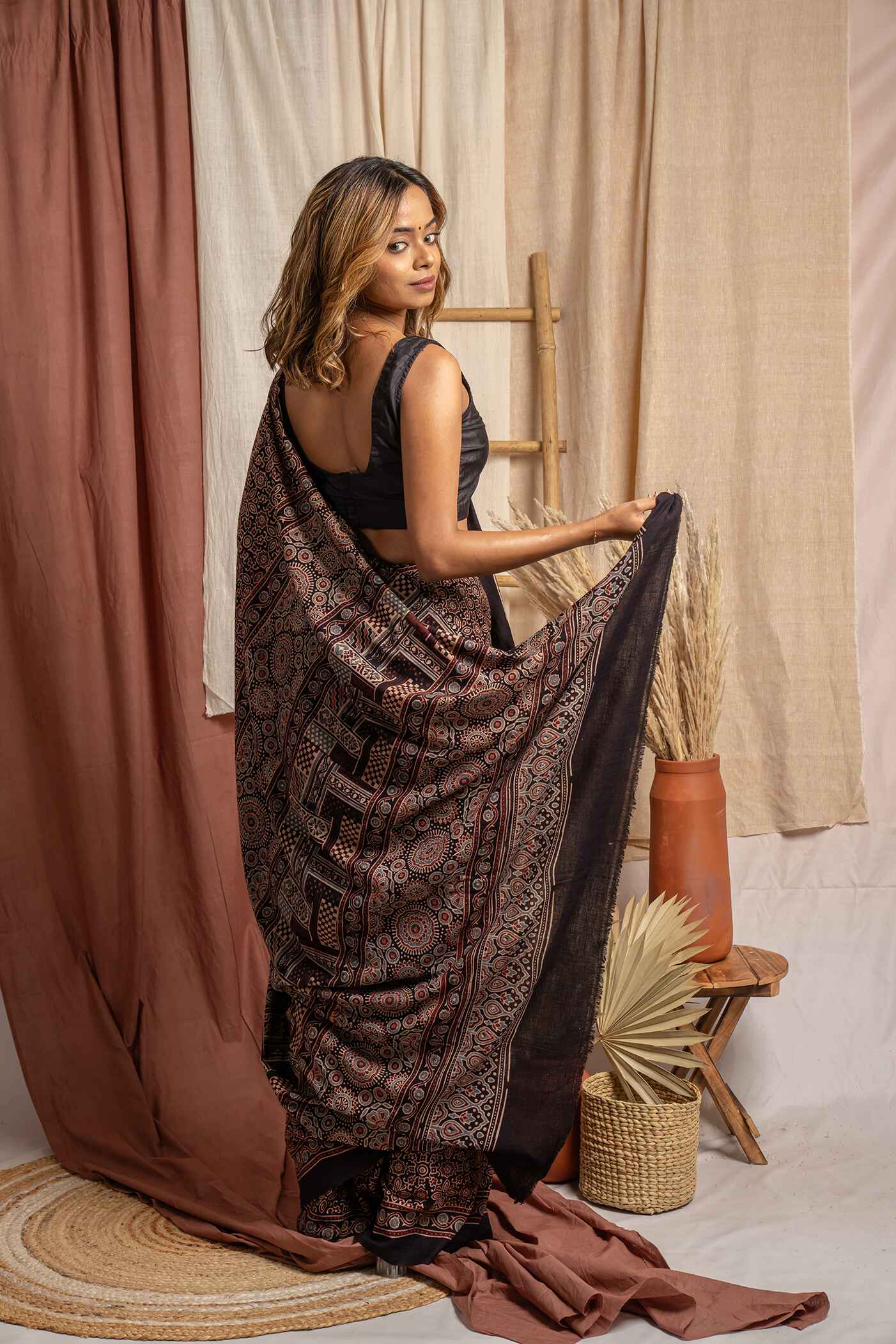 Black Ajrakh Khadi cotton saree with intricate hand block printed geometric patterns, crafted with natural dyes.