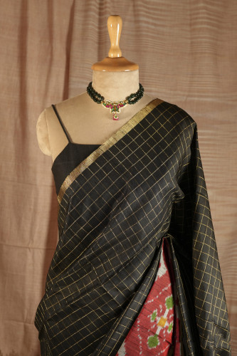 Khadi Tussar silk saree with gold check pattern on the body, intricate ikkat weave border and a bold red pallu.
