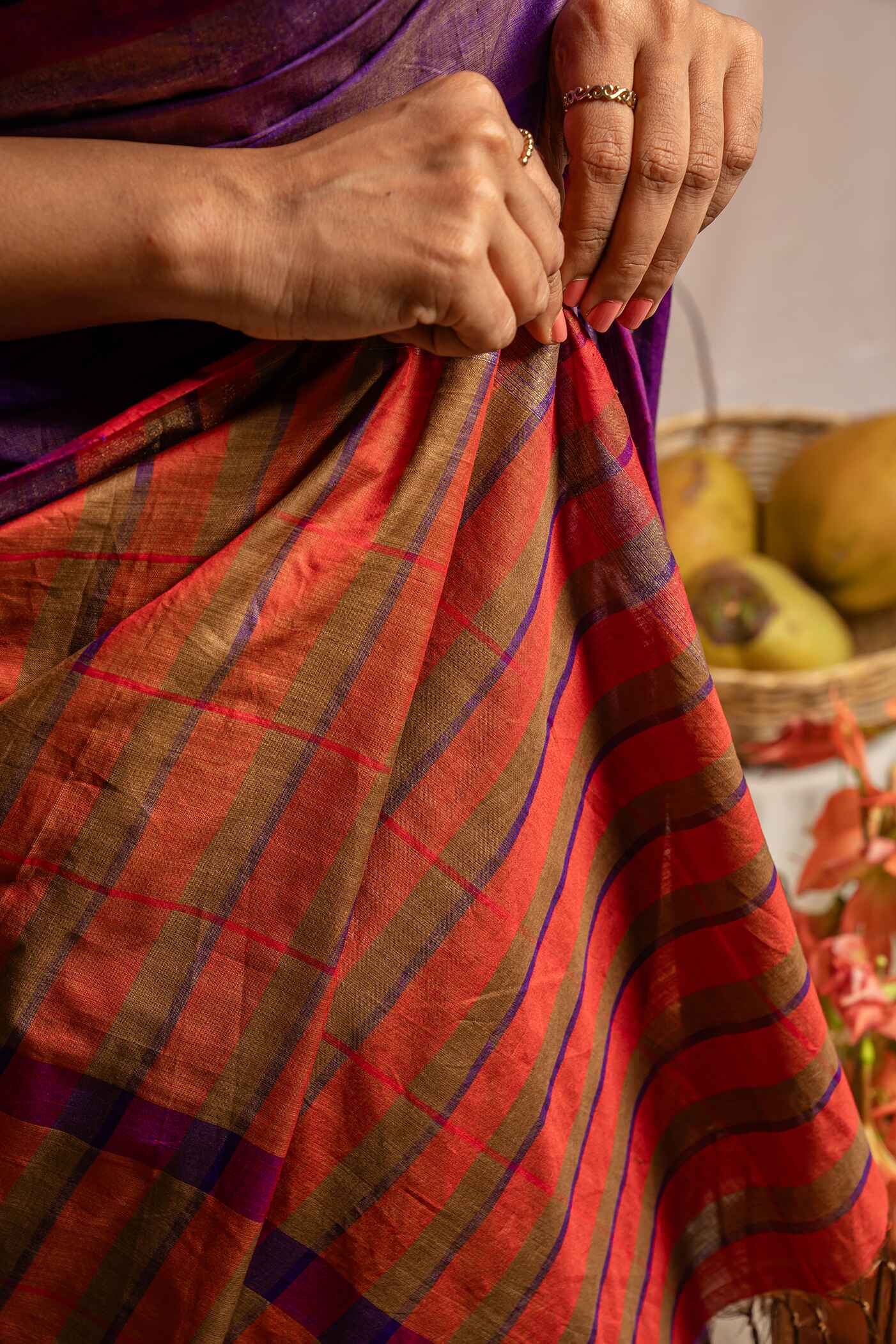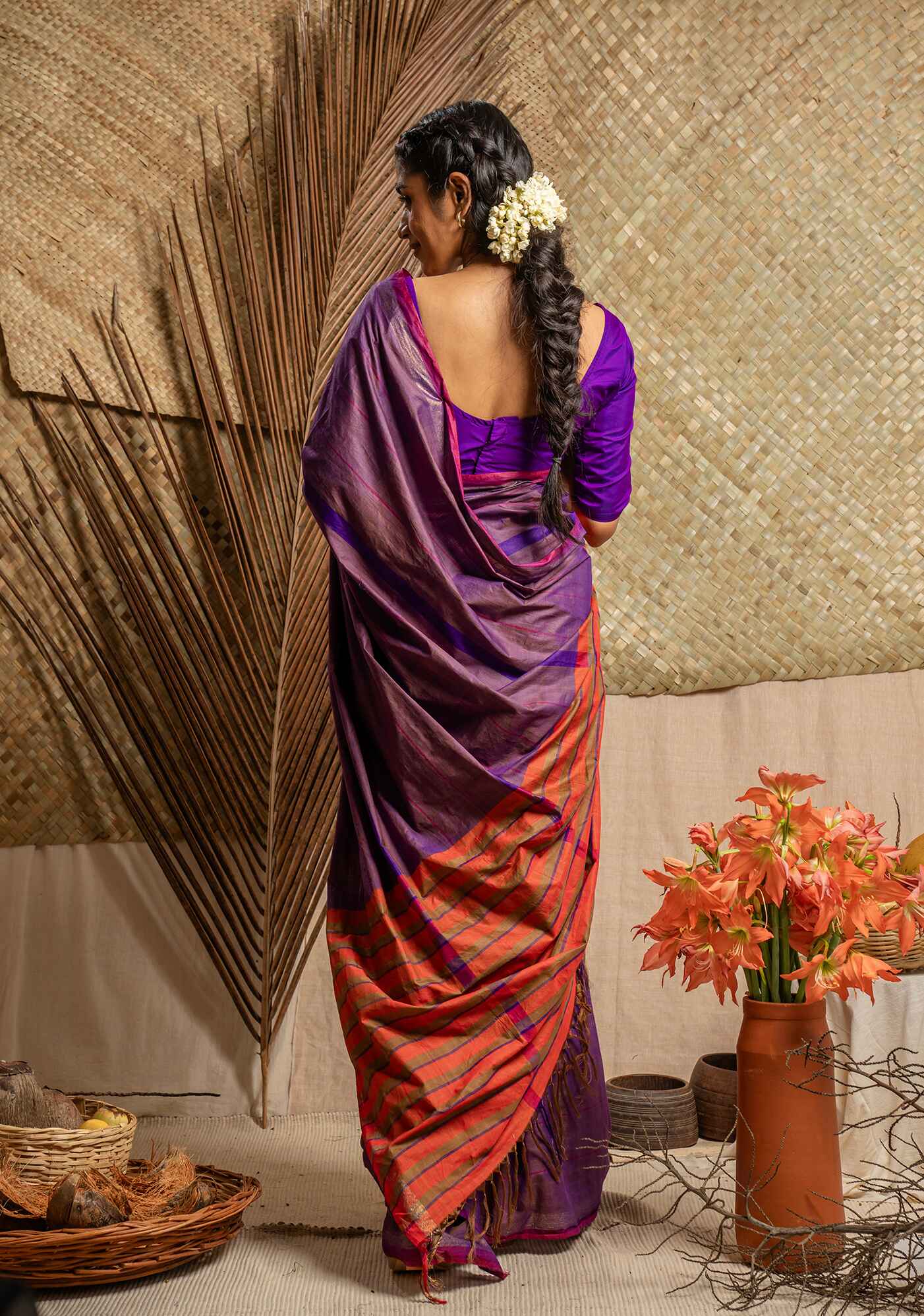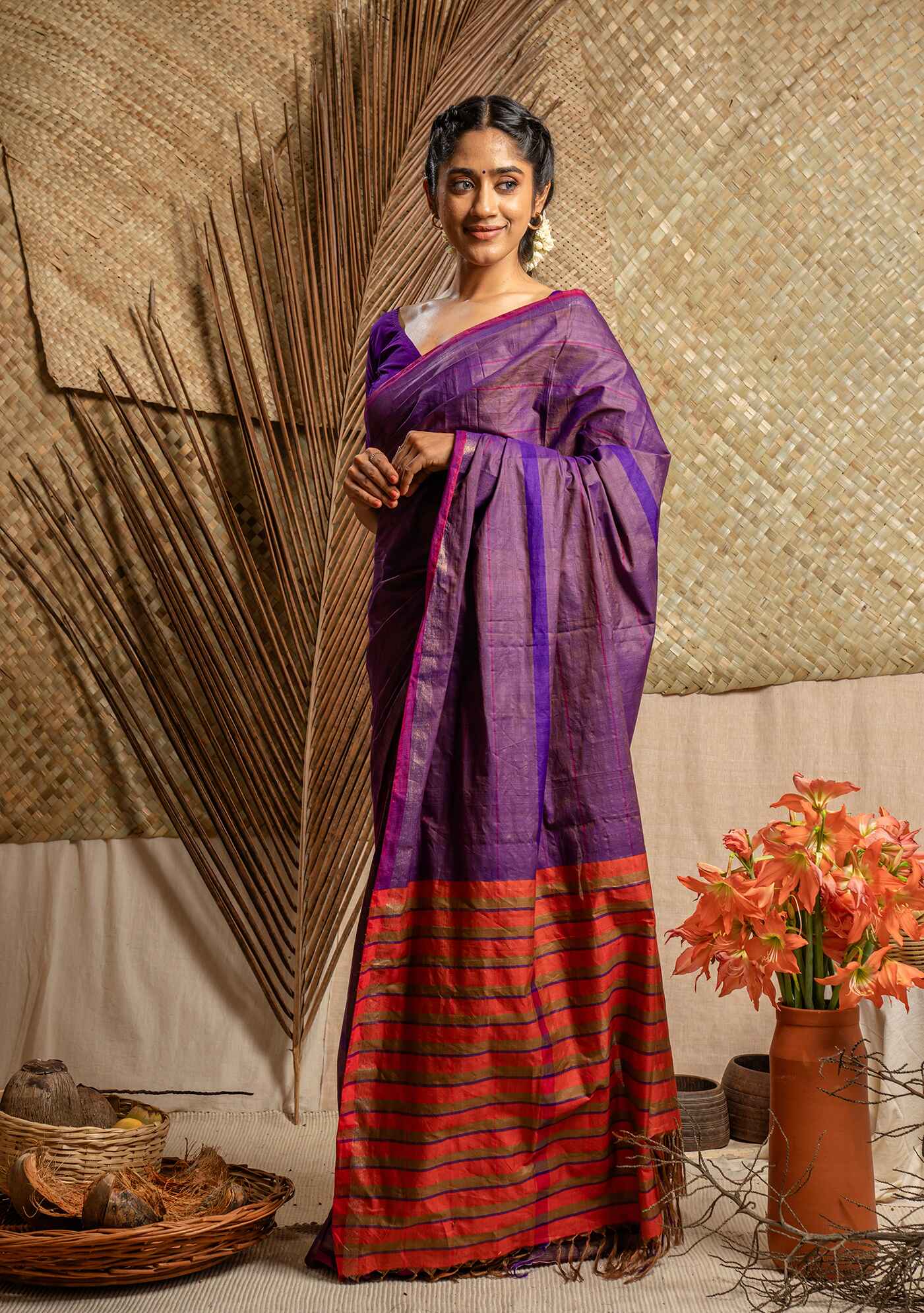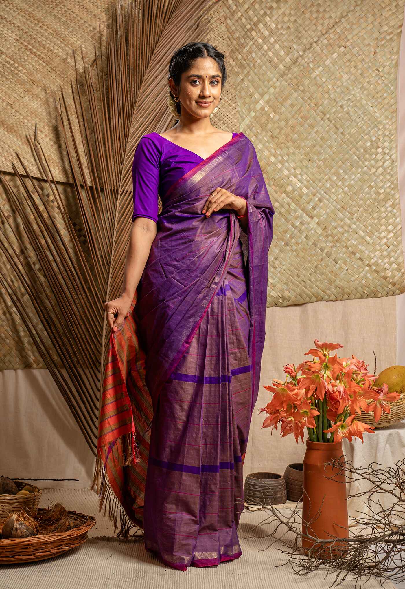 Handwoven cotton saree with stripe detail on body and contrast pallu.