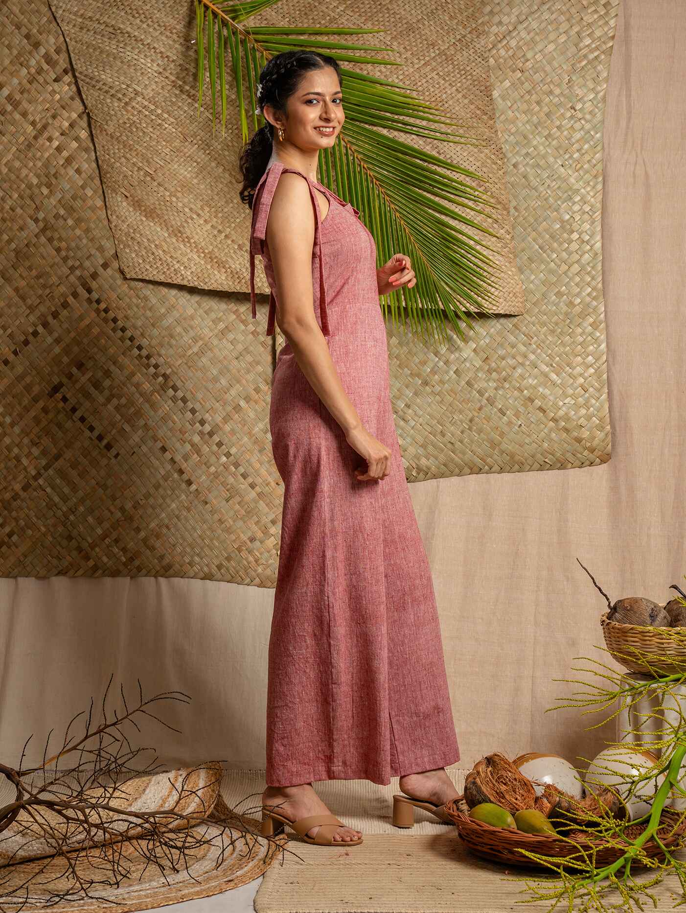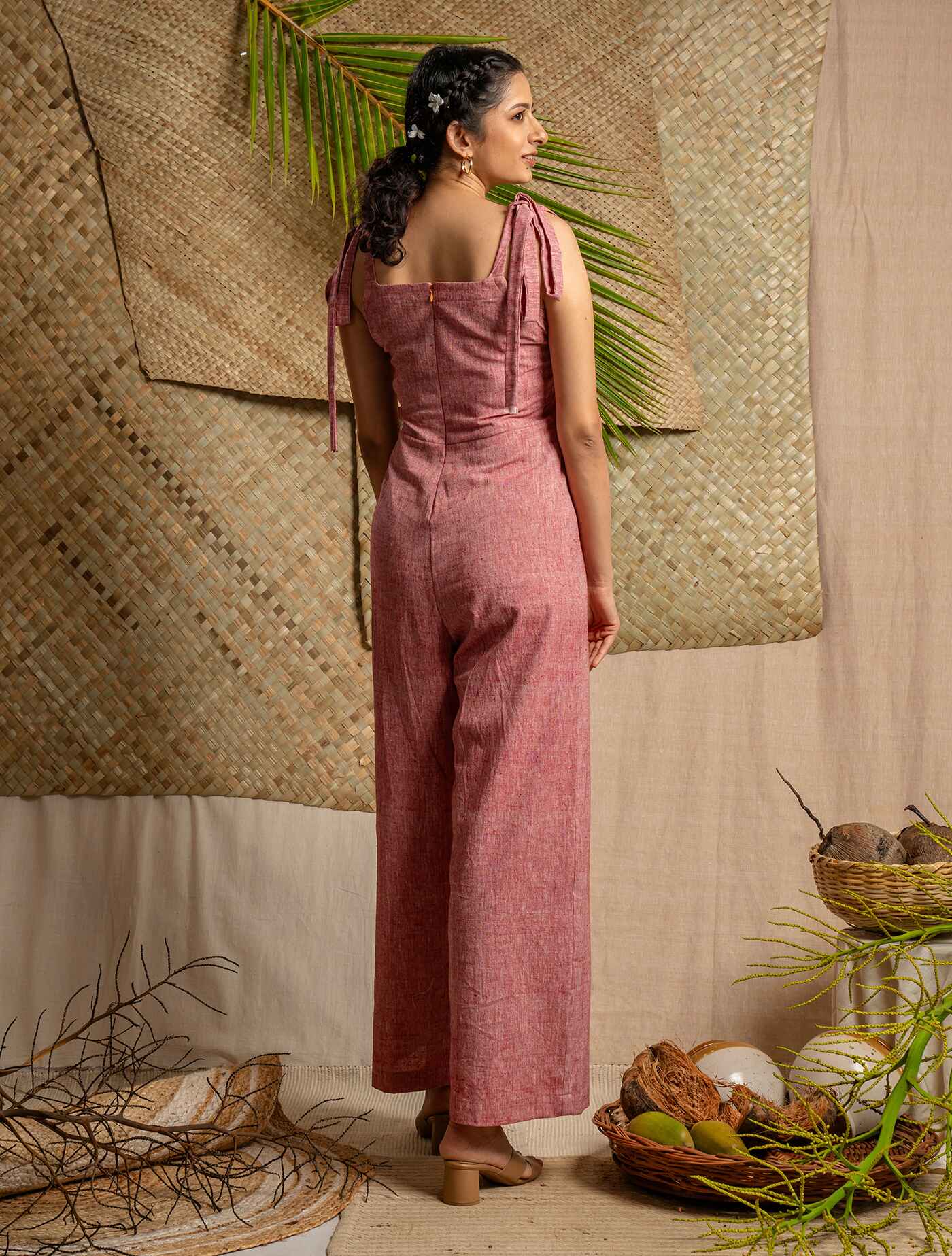 Jumpsuit with tie at shoulder and a zip opening at the back