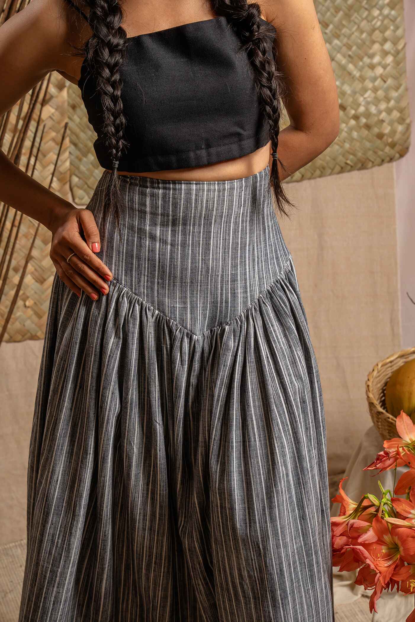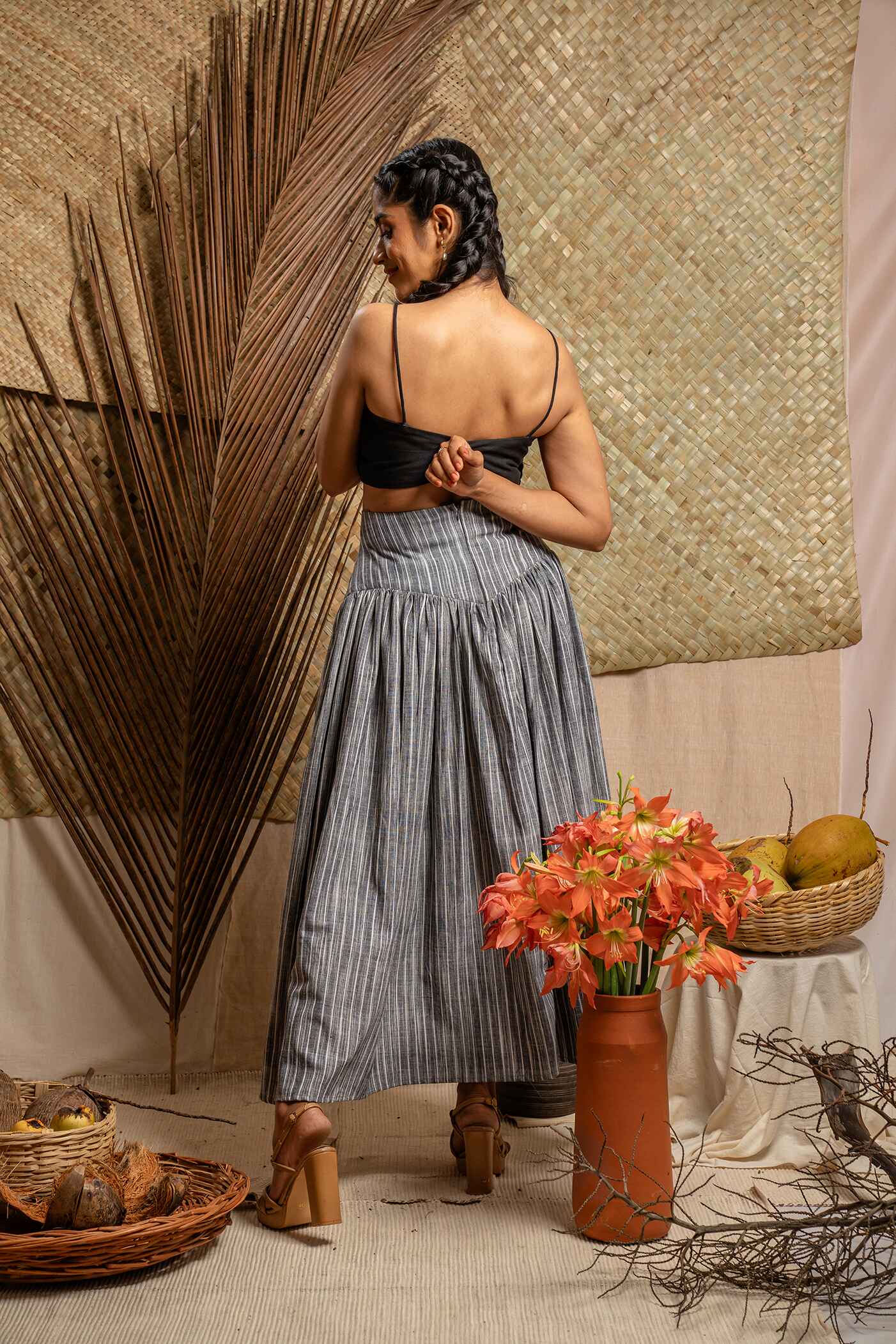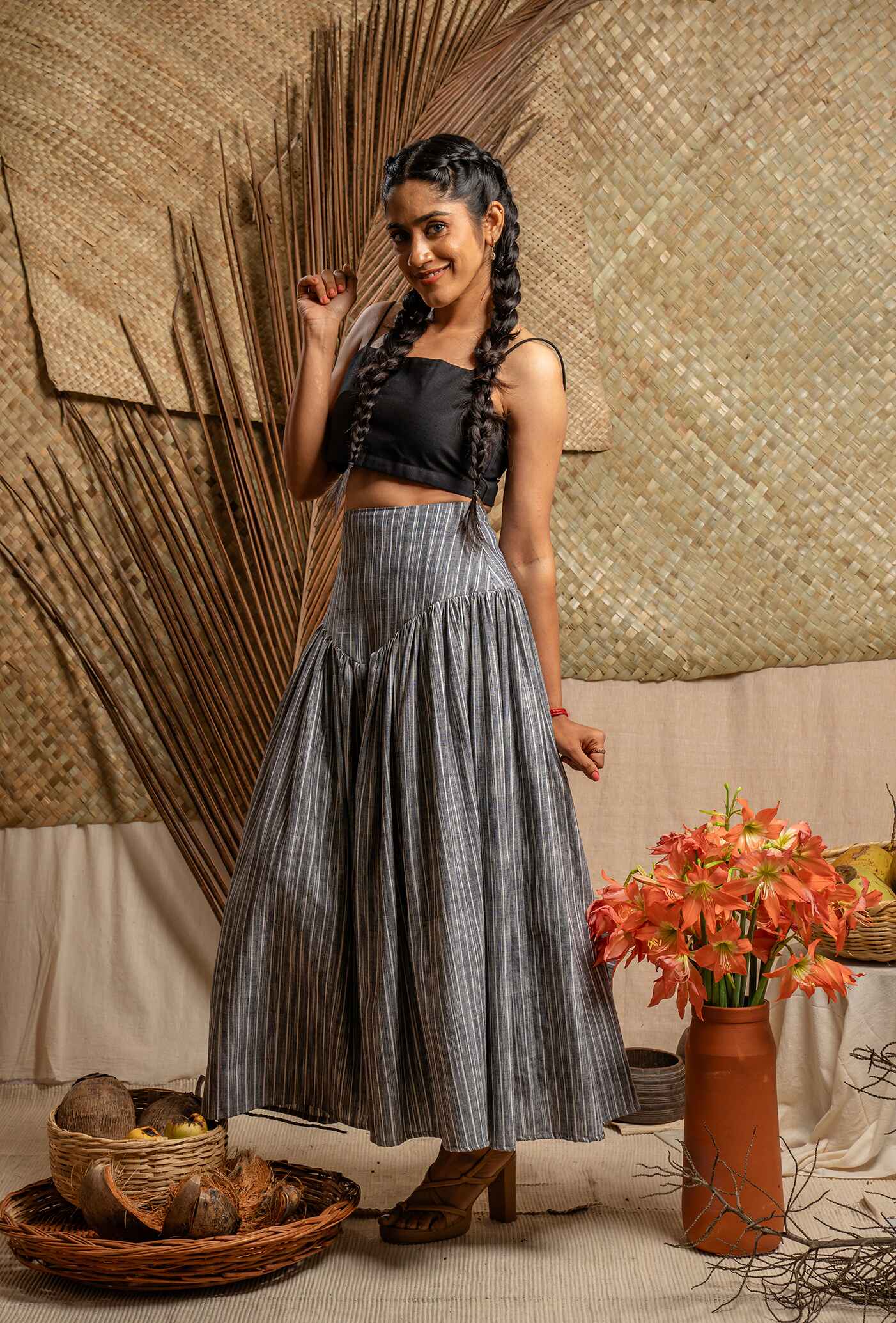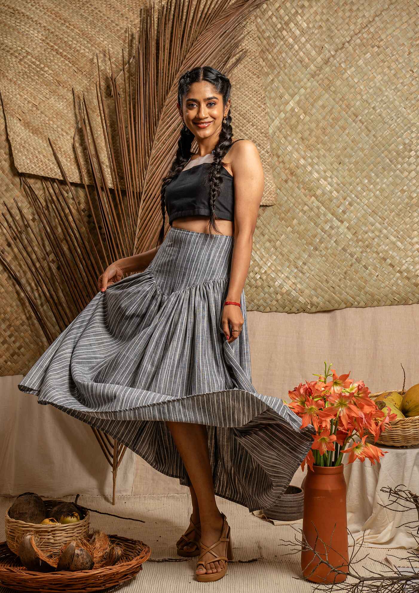 Grey, black weave pattern fit and flare skirt with Zipper opening at back.