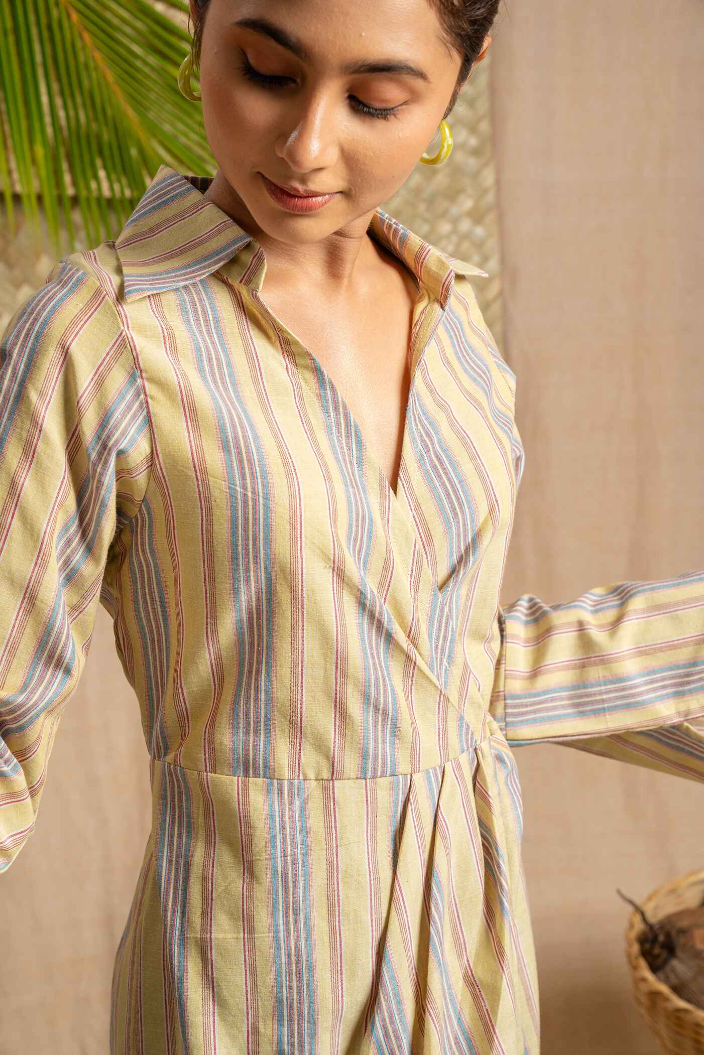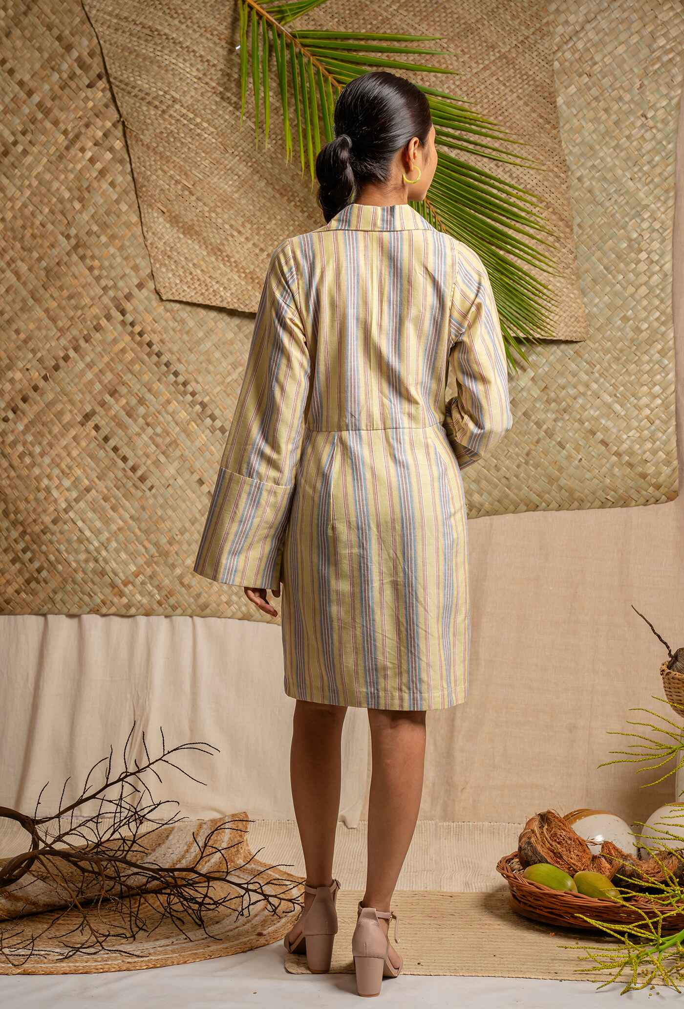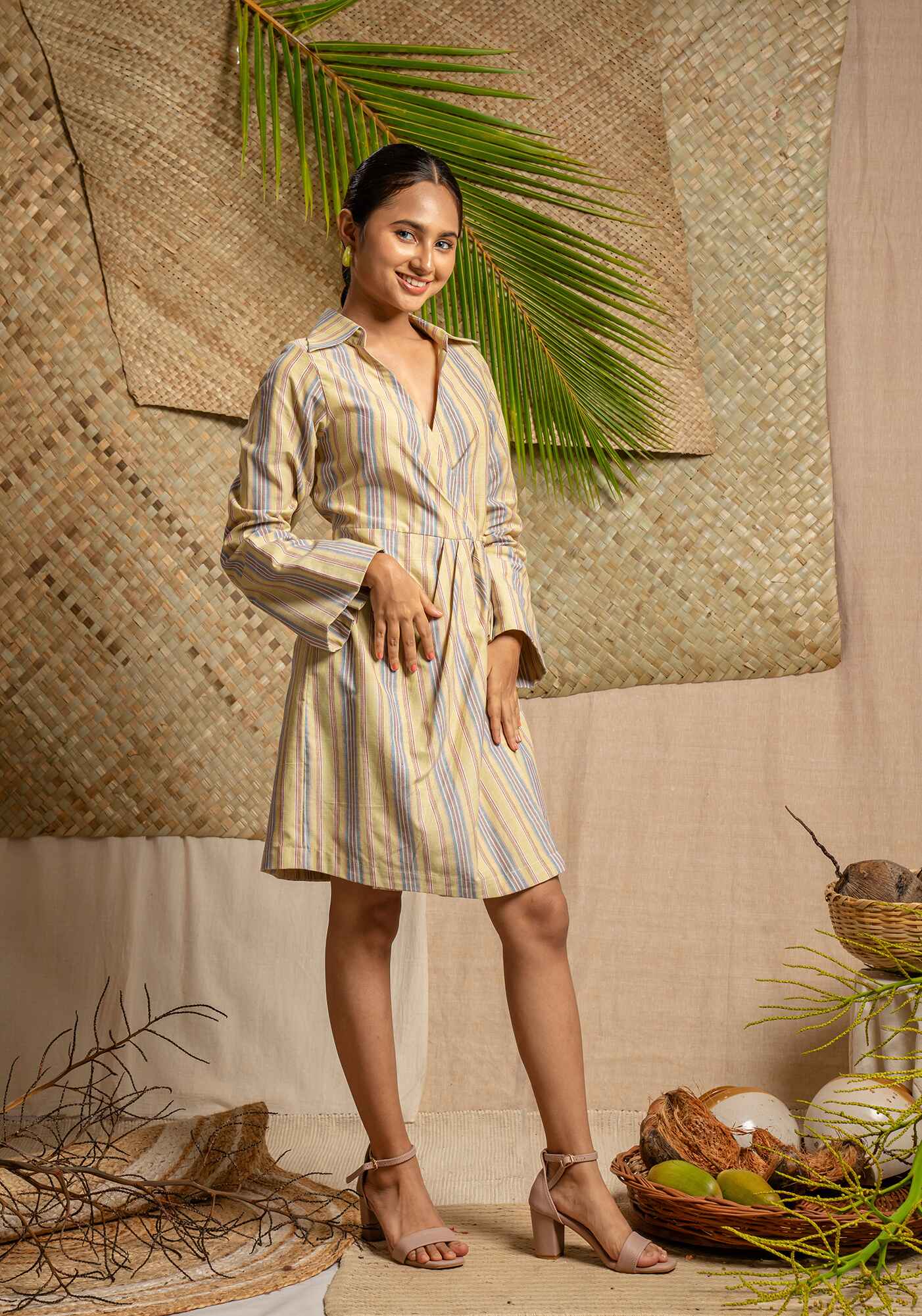 Wrap yourself in style with our striped collar mini dress featuring dramatic bell sleeves