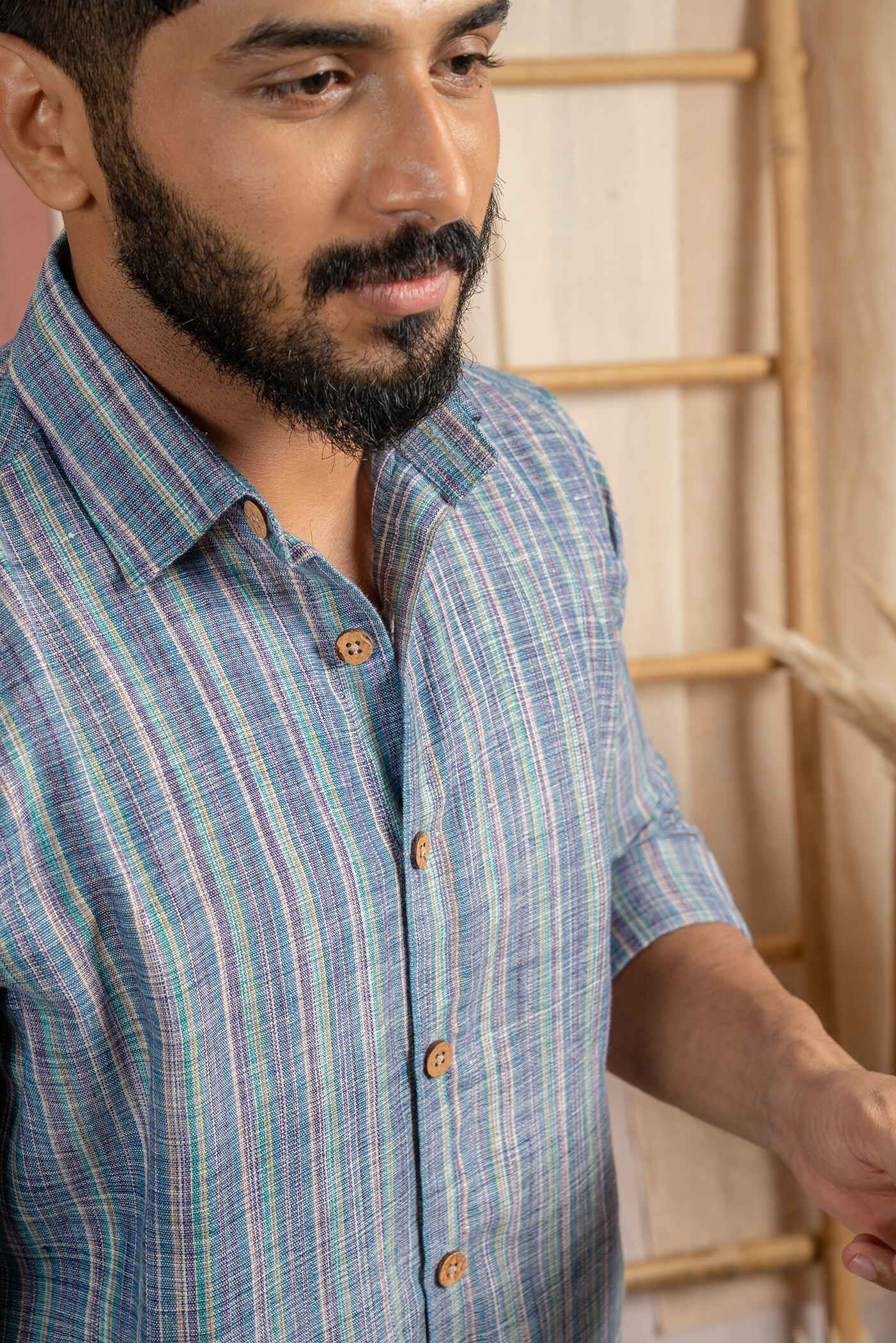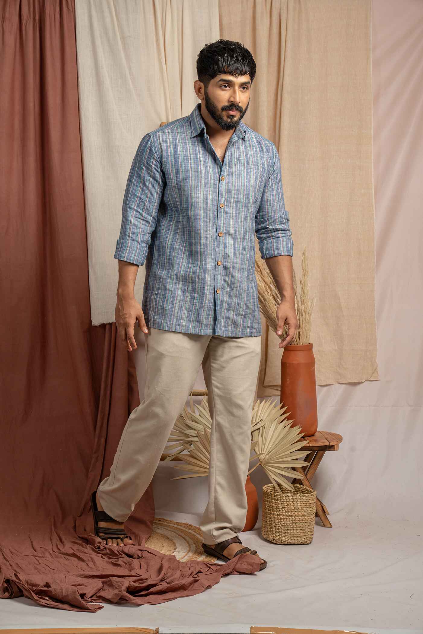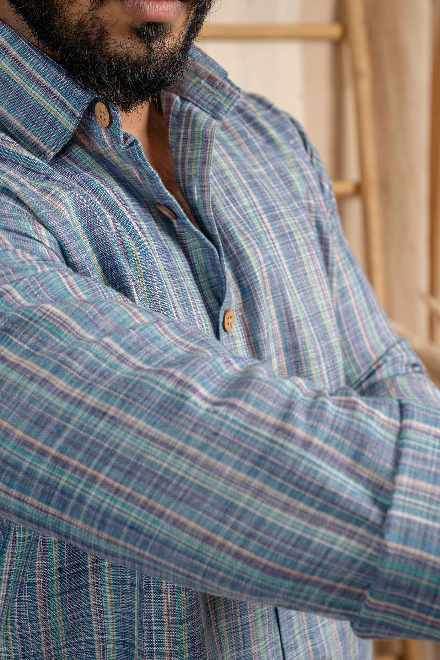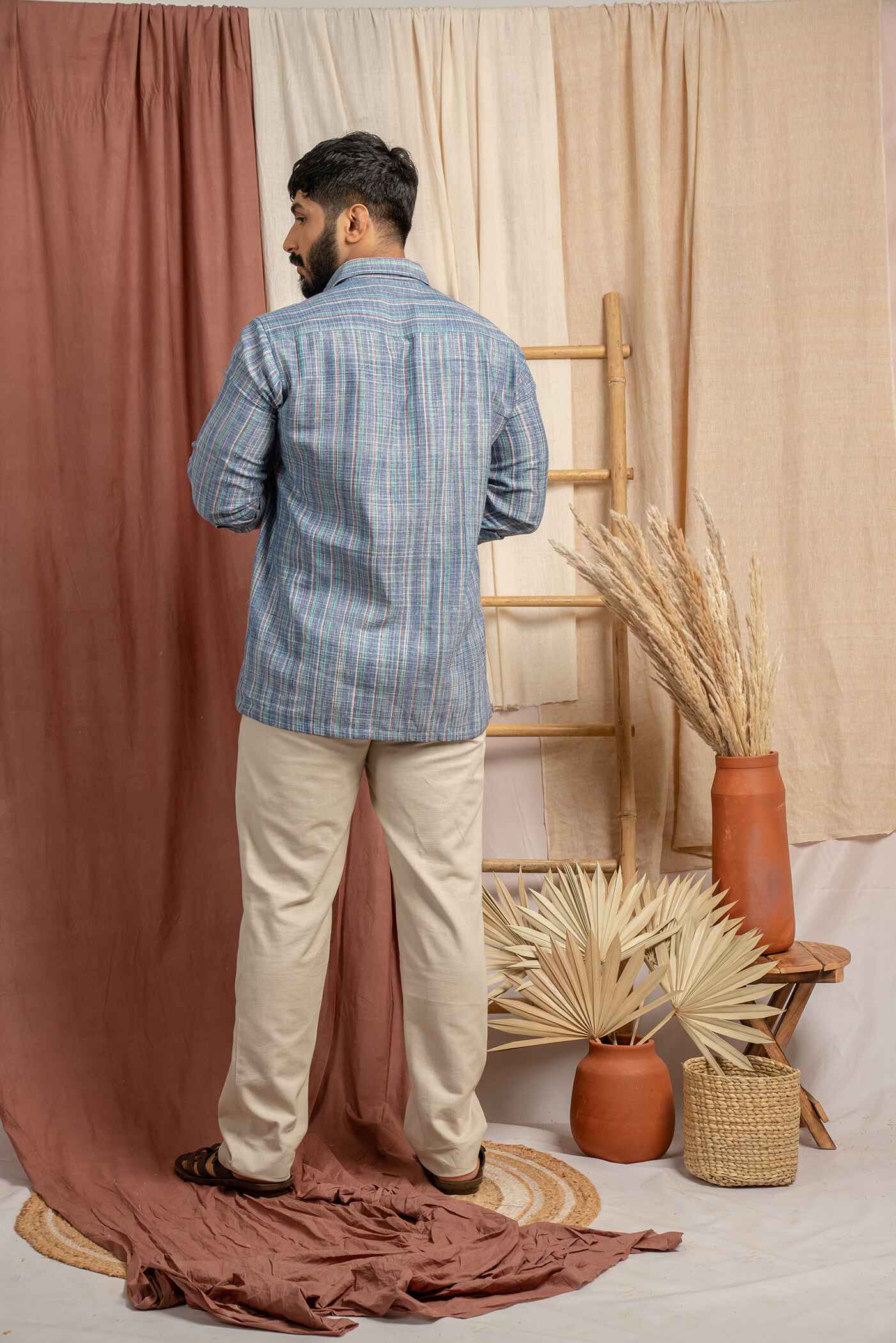 Blue colour khadi cotton shirt with classic collar, full sleeves and multicolour dainty checkered weave pattern
